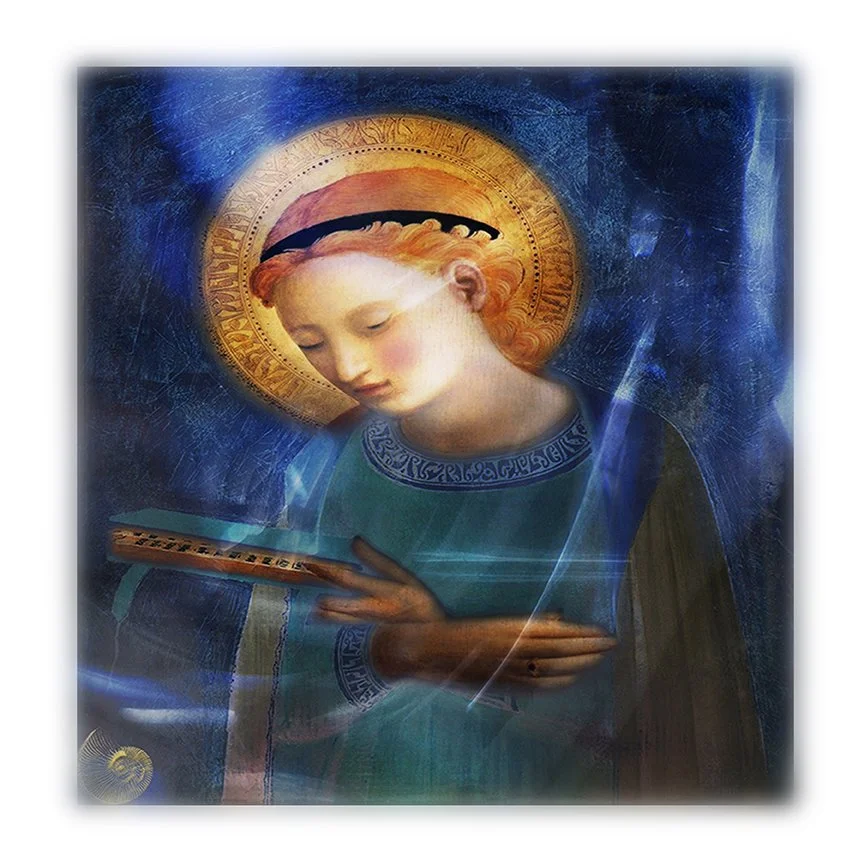 Virgin Annunciate, Fra Angelico, 1450; Public Domain; additional artwork and collage by Juliette Pierce Kent.